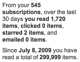Screenshot di atas adalah diambil sebentar tadi sehari sebelum Google Reader ditutup. Ia merupakan statistik bahan bacaan yang telah dibaca oleh saya sepanjang menggunakan Google Reader. Selamat tinggal Google Reader. Sebenarnya Google Reader tidak perlu ditutup, ia perlu lebih berevolusi mengikut selera pengguna ketika ini.